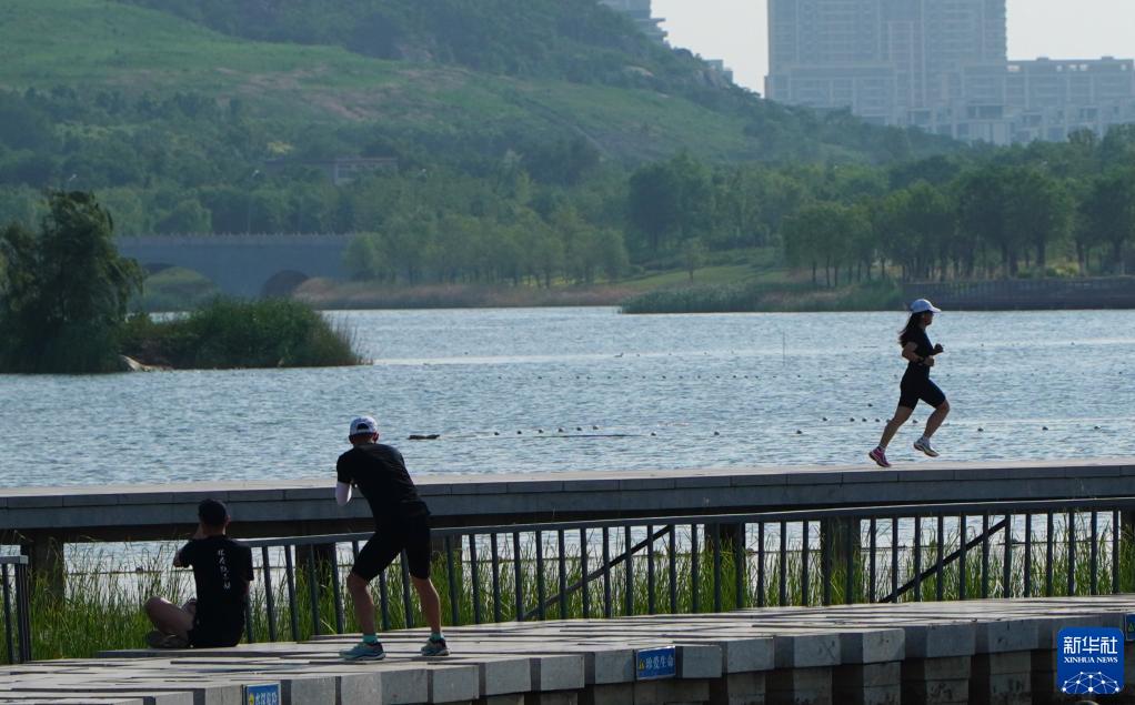 6月4日,市民在濟南市華山濕地公園休閑健身。