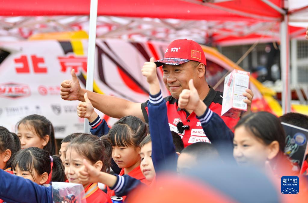 5月27日,在位于新疆和田地區大漠湖楊生態(tài)景區的環(huán)塔營(yíng)地,北京汽車(chē)車(chē)隊的領(lǐng)航員陳峰與前來(lái)參觀(guān)游玩的小學(xué)生們合影。