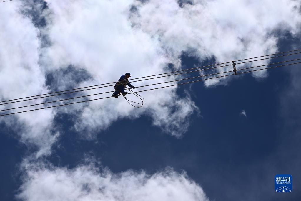 在青海省海西蒙古族藏族自治州格爾木市唐古拉山鎮境內,檢修人員在走線(xiàn)巡檢中(6月3日攝)。
