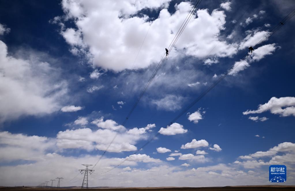在青海省海西蒙古族藏族自治州格爾木市唐古拉山鎮境內,檢修人員在走線(xiàn)巡檢中(6月3日攝)。