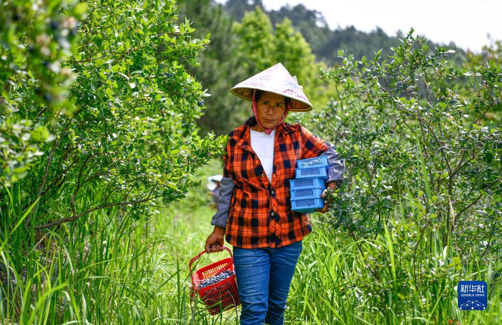 6月4日,村民在貴州省麻江縣藍夢(mèng)谷生態(tài)藍莓園搬運藍莓。