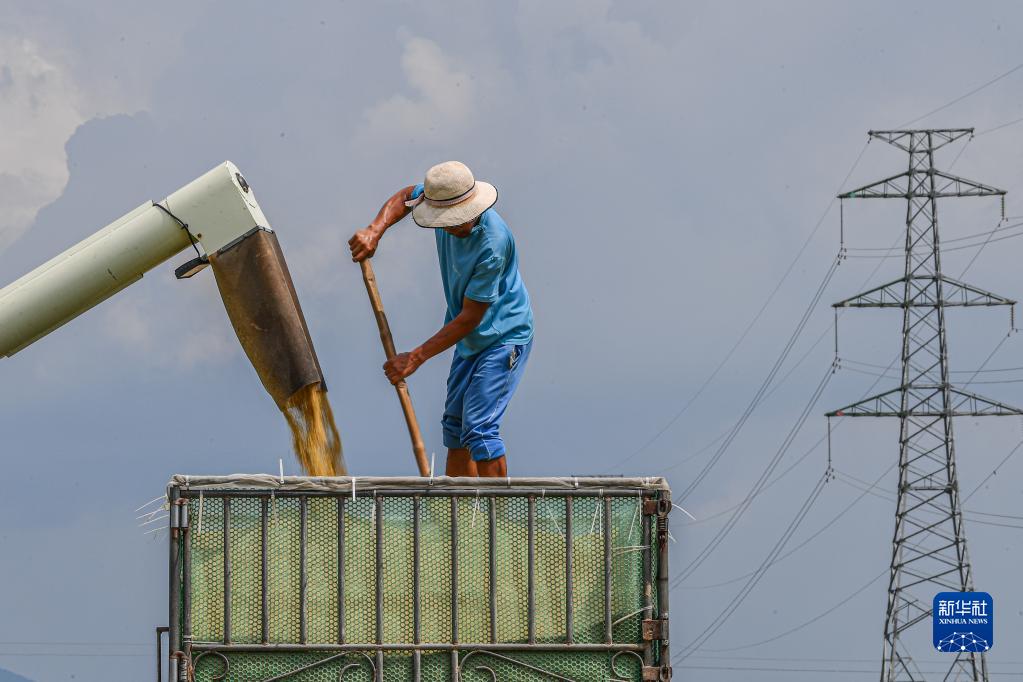 6月4日,在位于海南省東方市的海南農樂(lè )南繁科技有限公司制種基地,工人整理從收割機上卸下的稻種。