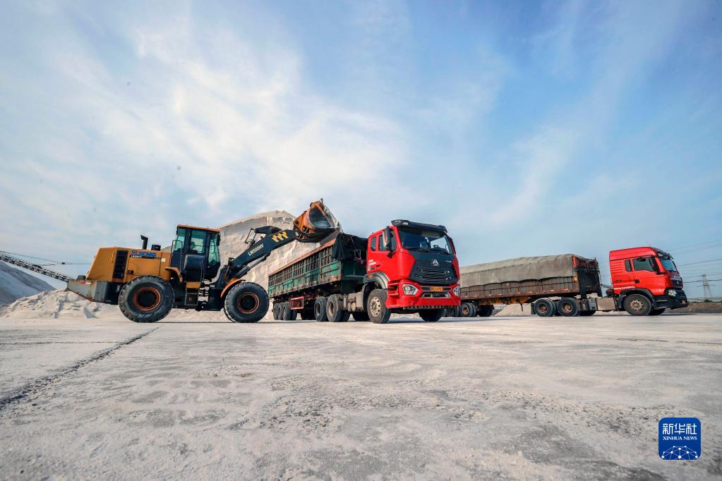 6月4日,工人操作設備在唐山海港經(jīng)濟開(kāi)發(fā)區長(cháng)蘆大清河鹽場(chǎng)將海鹽裝車(chē),準備外運。