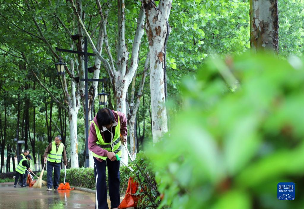 6月4日,在河南省南陽(yáng)市全民健身公園,環(huán)保志愿者和環(huán)衛工人在撿拾垃圾。