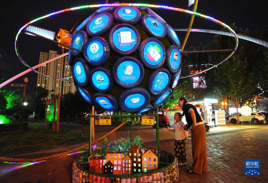 6月3日,在山東省滕州市市民廣場(chǎng),市民觀(guān)看利用廢舊電動(dòng)車(chē)外胎和易拉罐、一次性筷子等廢棄物制作的“生態(tài)地球”模型。
