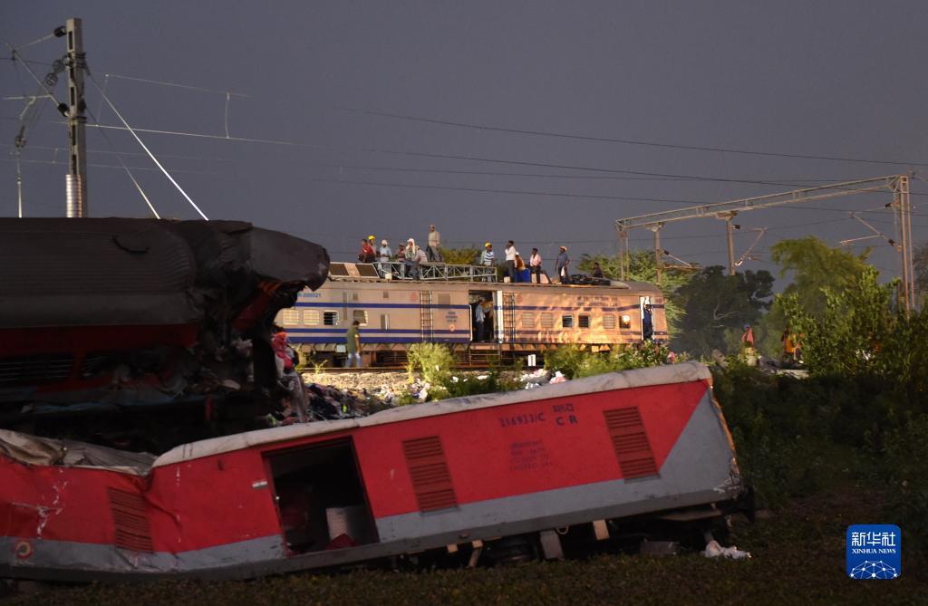 這是6月4日在印度奧迪沙邦巴拉索爾地區拍攝的列車(chē)脫軌相撞事故現場(chǎng)。