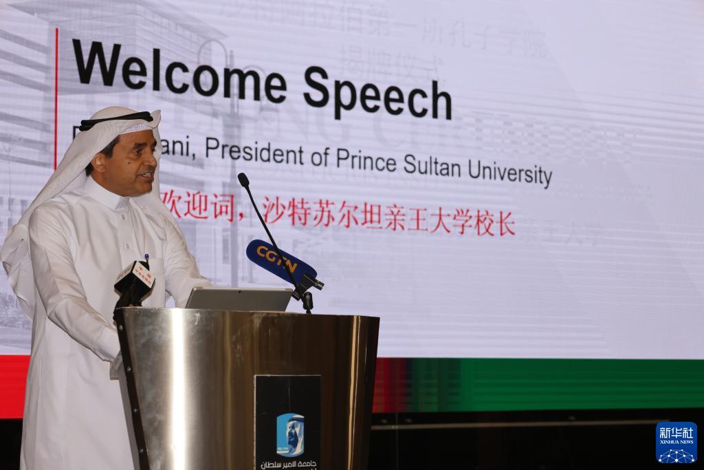 6月4日,在沙特阿拉伯首都利雅得,蘇爾坦親王大學(xué)校長(cháng)艾哈邁德在蘇爾坦親王大學(xué)孔子學(xué)院揭牌儀式上致辭。