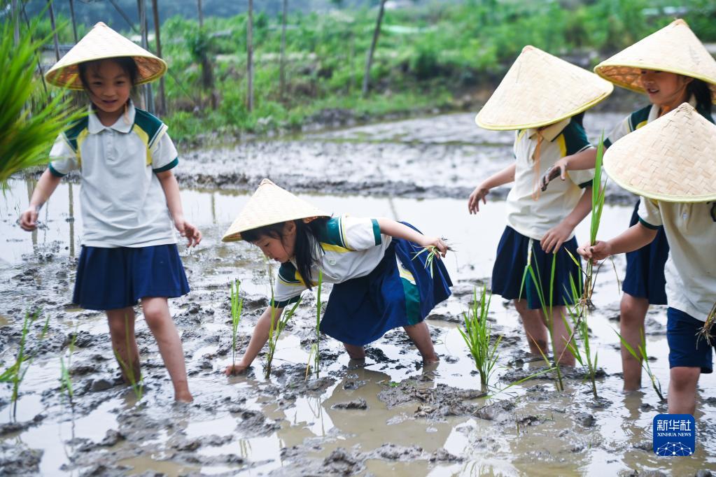 6月5日,孩子們在道場(chǎng)鄉格林農莊的稻田里體驗插秧。