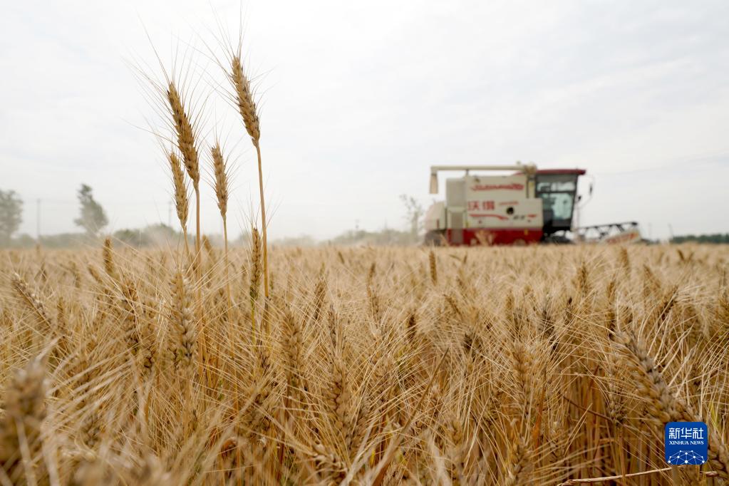 6月5日,聯(lián)合收割機在河北省沙河市下鄭村收割小麥。