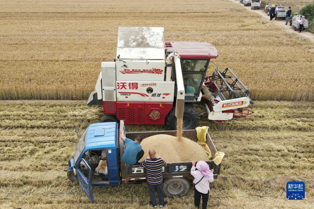 6月5日,農民在河北省沙河市下鄭村的麥田里將收獲的小麥裝車(chē)(無(wú)人機照片)。