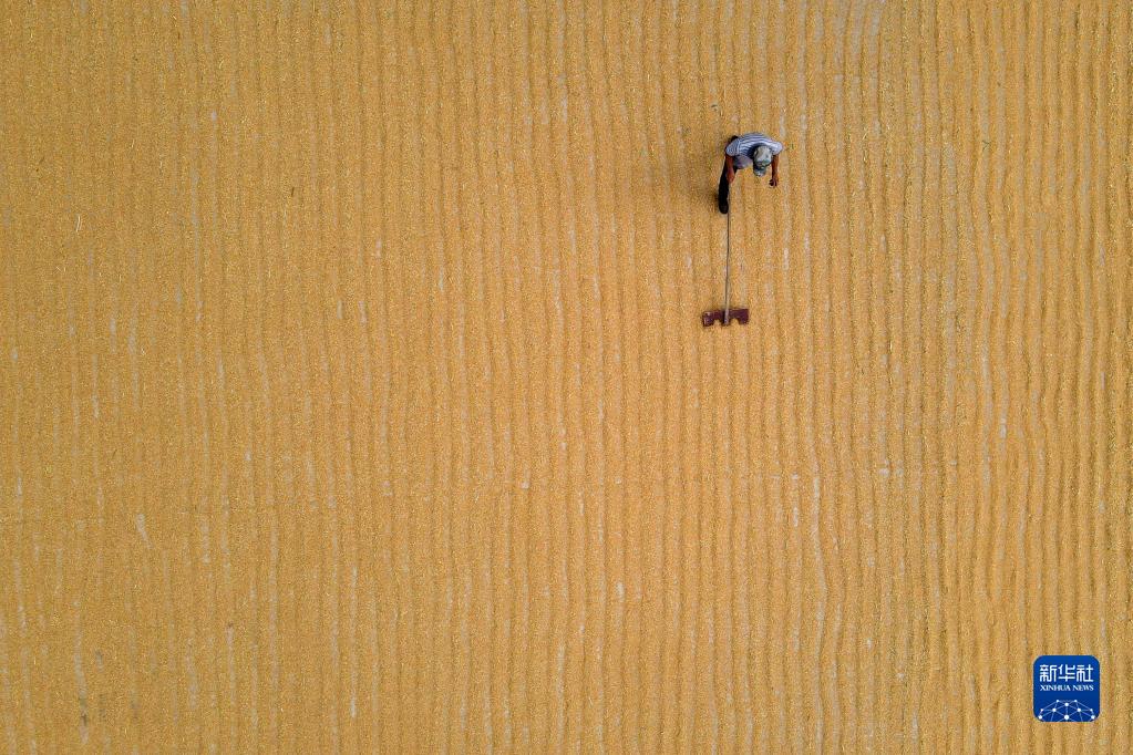 6月5日,河北省沙河市贊善村農民在晾曬收獲的小麥(無(wú)人機照片)。