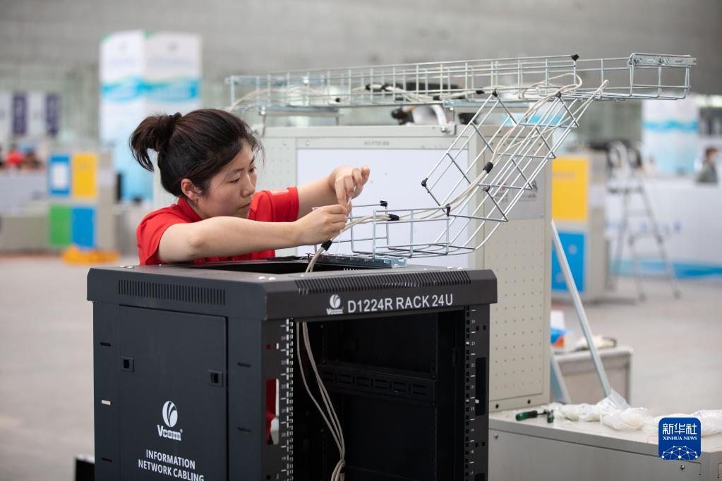 6月5日,選手在參加信息網(wǎng)絡(luò )布線(xiàn)比賽。