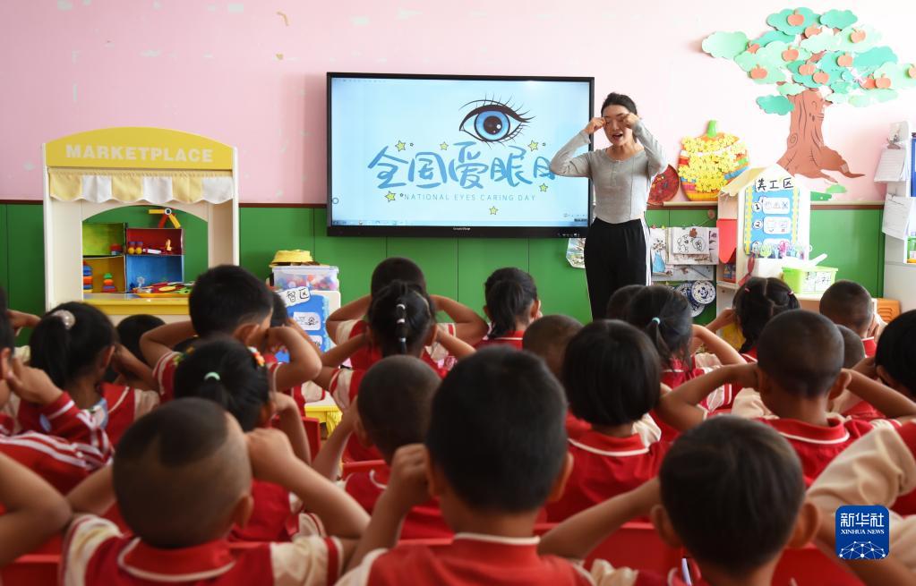 6月5日,在云南省麗江師范高等專(zhuān)科學(xué)校附屬新苗幼兒園,老師在指導小朋友做眼保健操。