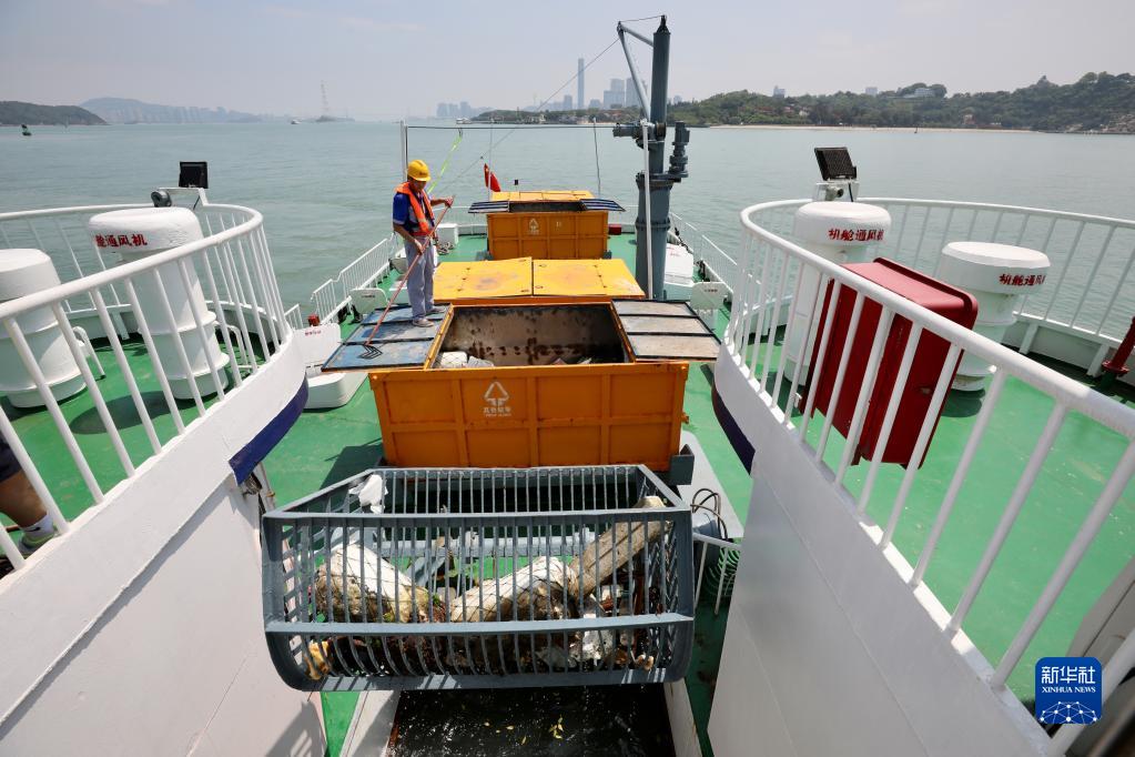 廈門(mén)海上環(huán)衛站“廈海環(huán)003號”海上環(huán)衛船在收集海漂垃圾(6月4日攝)。