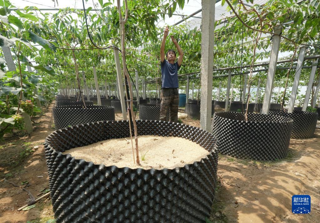 6月5日,盧龍縣木井鎮一名農民在大棚內管護軟棗獼猴桃。