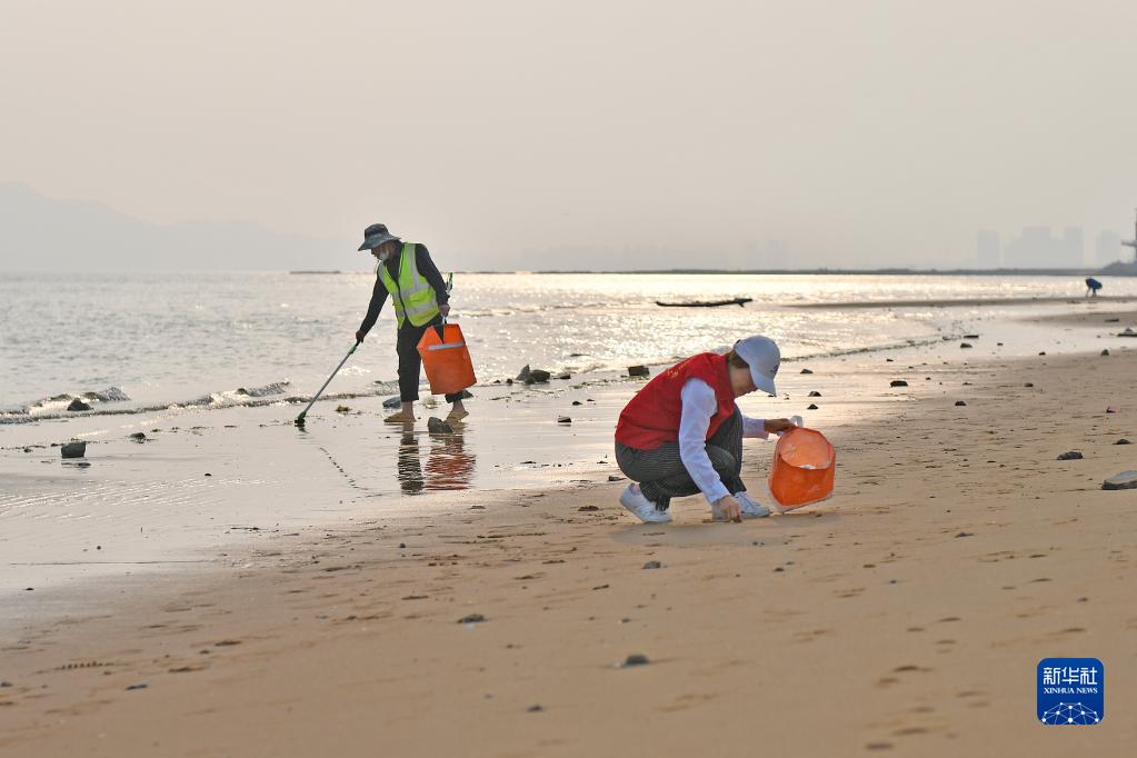 6月5日,山東省煙臺市福山區紅櫻桃愛(ài)心協(xié)會(huì )志愿者在金沙灘海水浴場(chǎng)拾垃圾。