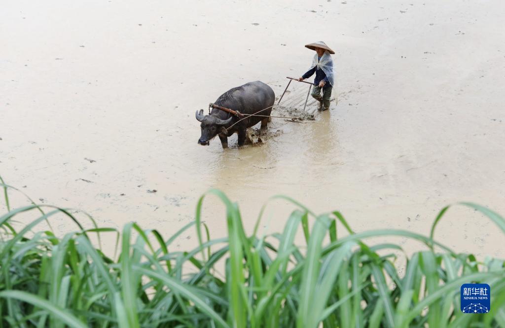6月5日,農民在貴州省黔東南苗族侗族自治州施秉縣雙井鎮翁西村耙田,準備插秧。