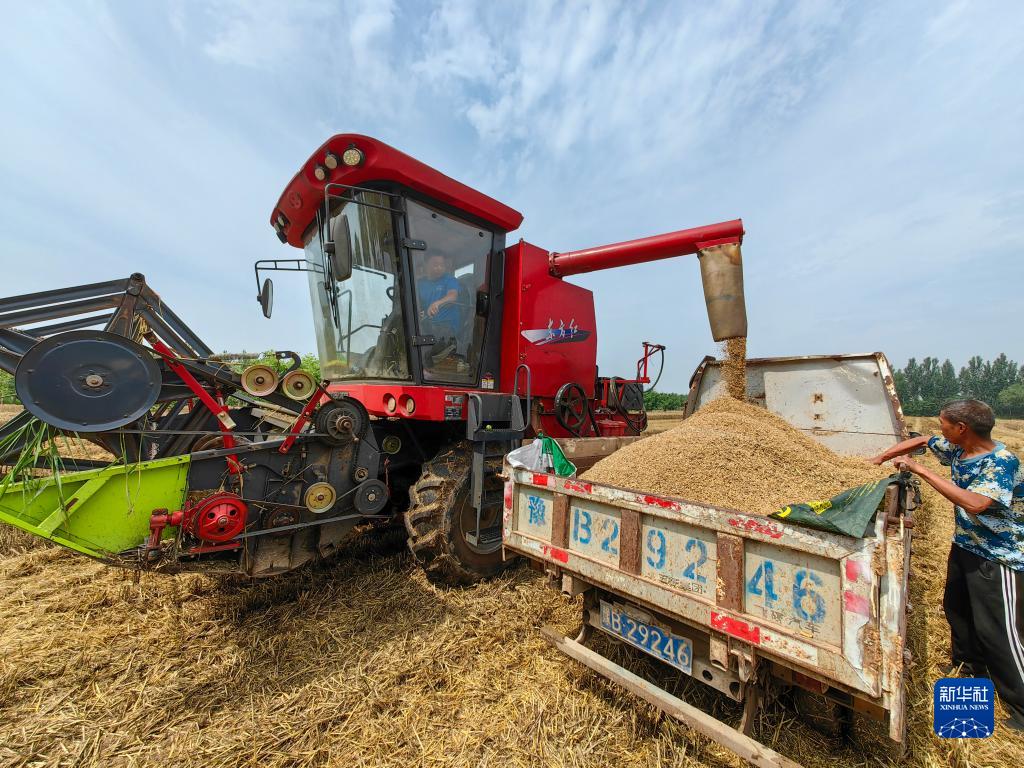 6月5日,在河南省開(kāi)封市城鄉一體化示范區水稻鄉單寨村,農機手將收獲的小麥裝車(chē)。