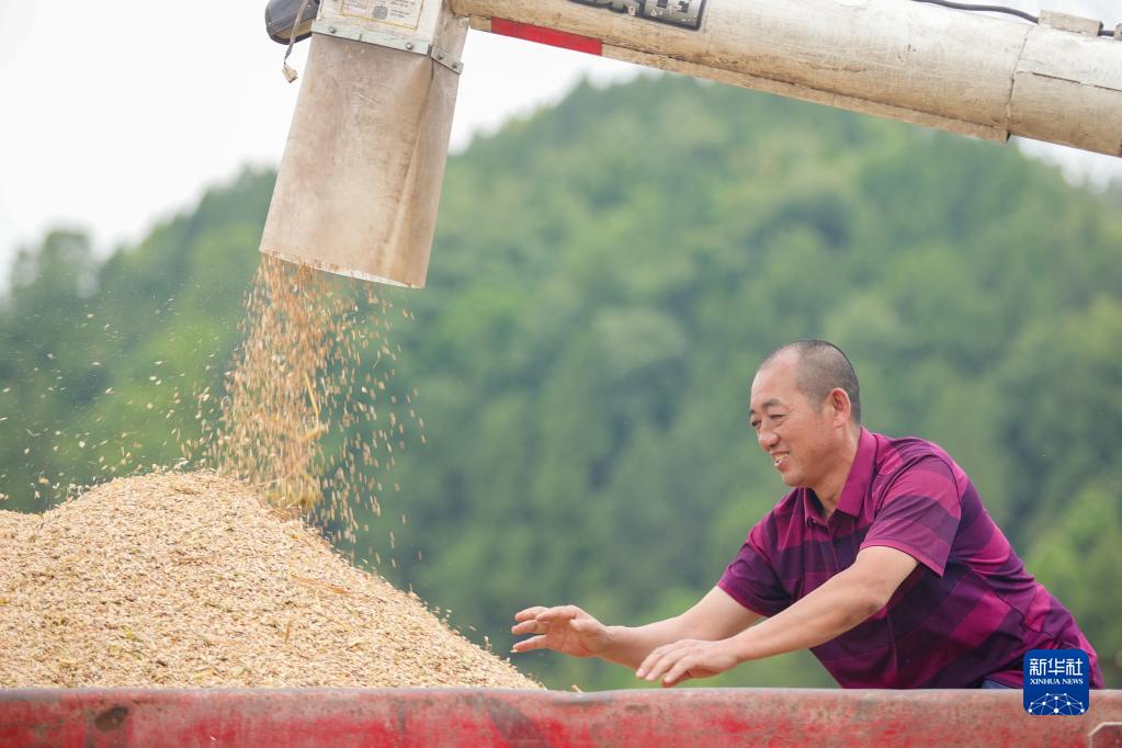 5月18日,在四川遂寧射洪市仁和鎮水頭寨村,農民將小麥裝車(chē)。