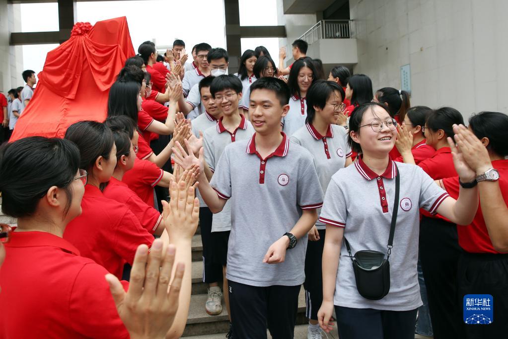 6月5日,浙江省東陽(yáng)中學(xué)老師們和高三學(xué)生擊掌,為他們加油鼓勁。