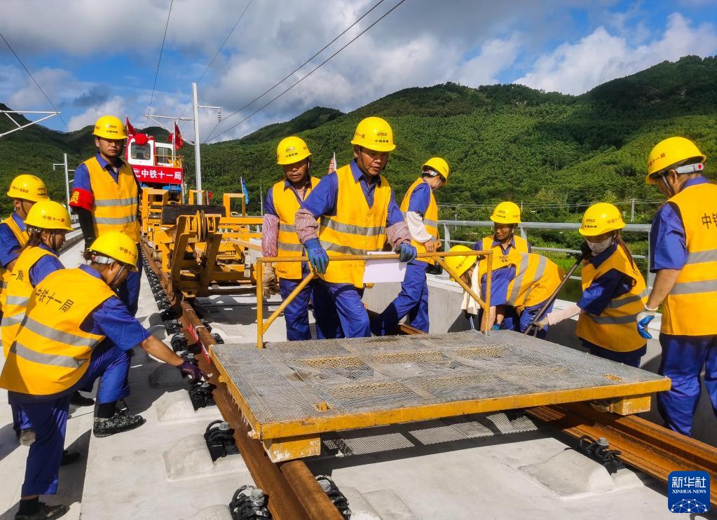6月6日,中鐵十一局鋪軌機組施工人員在汕汕鐵路汕尾螺河特大橋上進(jìn)行鋪軌作業(yè)。