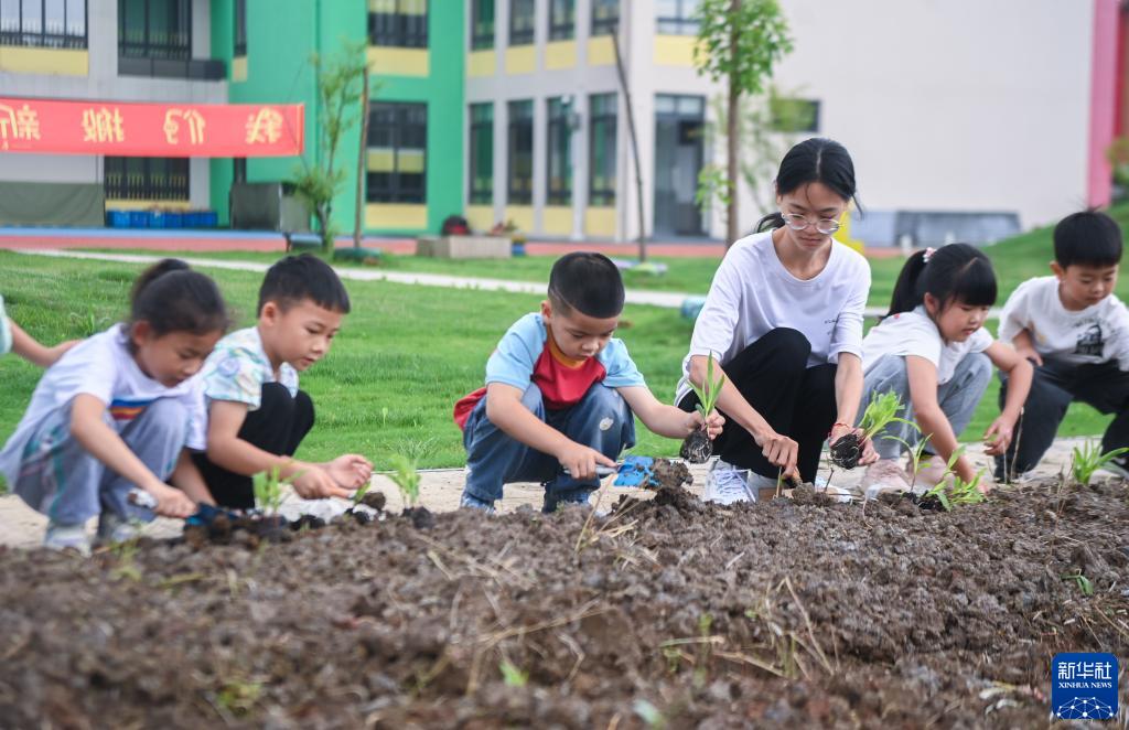 6月6日,孩子們在幼兒園的“農耕園”里跟著(zhù)老師一起種玉米苗。