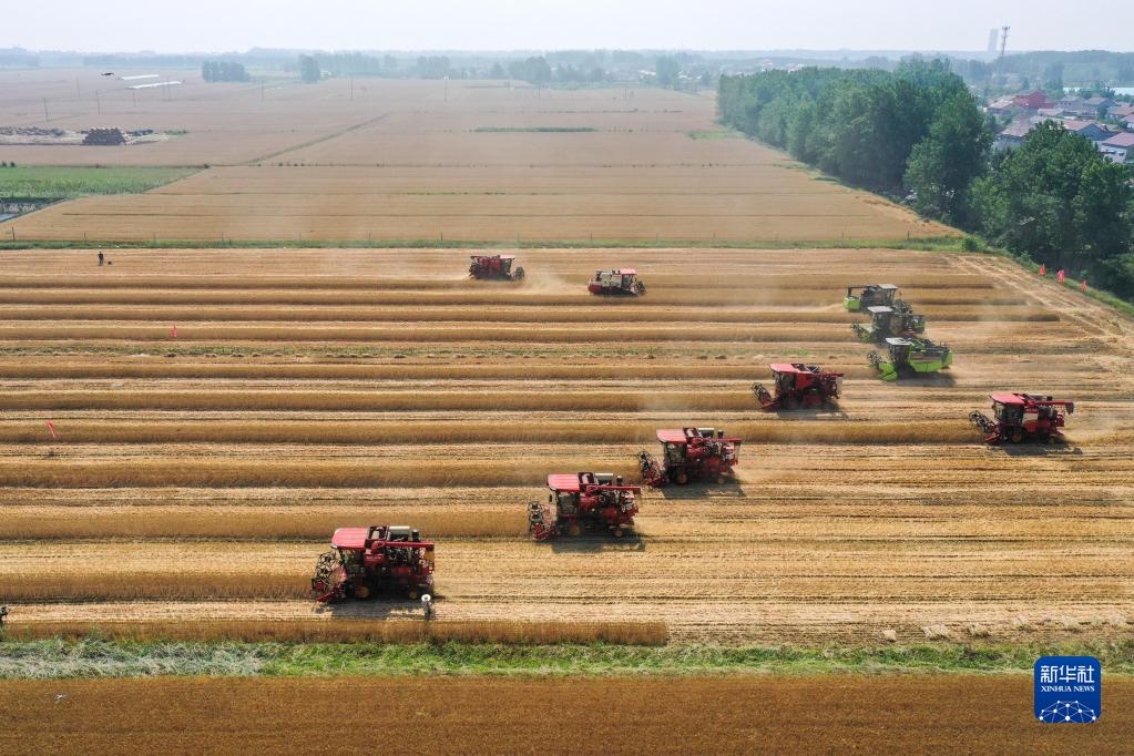 6月6日,農機手駕駛收割機進(jìn)行機收減損比武競賽(無(wú)人機照片)。