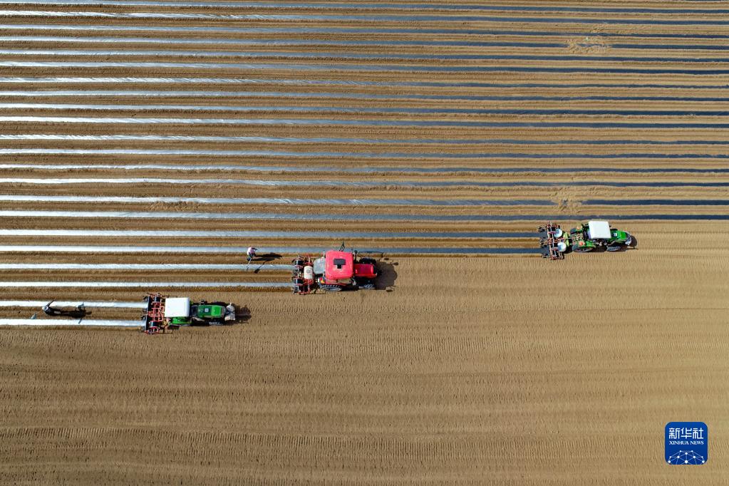 6月6日,農機在鄂托克前旗城川鎮麻黃套村的辣椒種植基地里作業(yè)(無(wú)人機照片)。