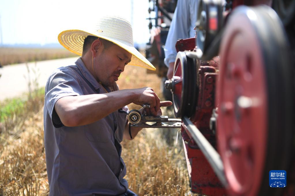 6月6日,在河南省安陽(yáng)市滑縣萬(wàn)古鎮,農機手在作業(yè)前檢修收割機。