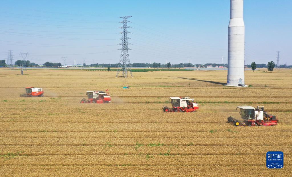 6月6日,在河南省安陽(yáng)市滑縣萬(wàn)古鎮,收割機在搶收種子田的小麥(無(wú)人機照片)。