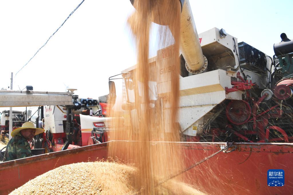6月6日,在河南省安陽(yáng)市滑縣萬(wàn)古鎮,收割機將收獲的小麥裝車(chē)。