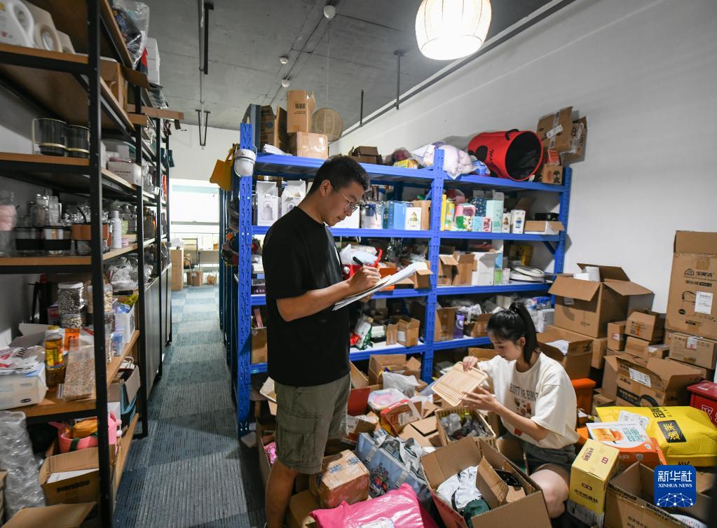 王光強(左)和妻子黃月在成都的電商公司里整理登記各個(gè)廠(chǎng)商寄來(lái)的產(chǎn)品樣品(6月1日攝)。