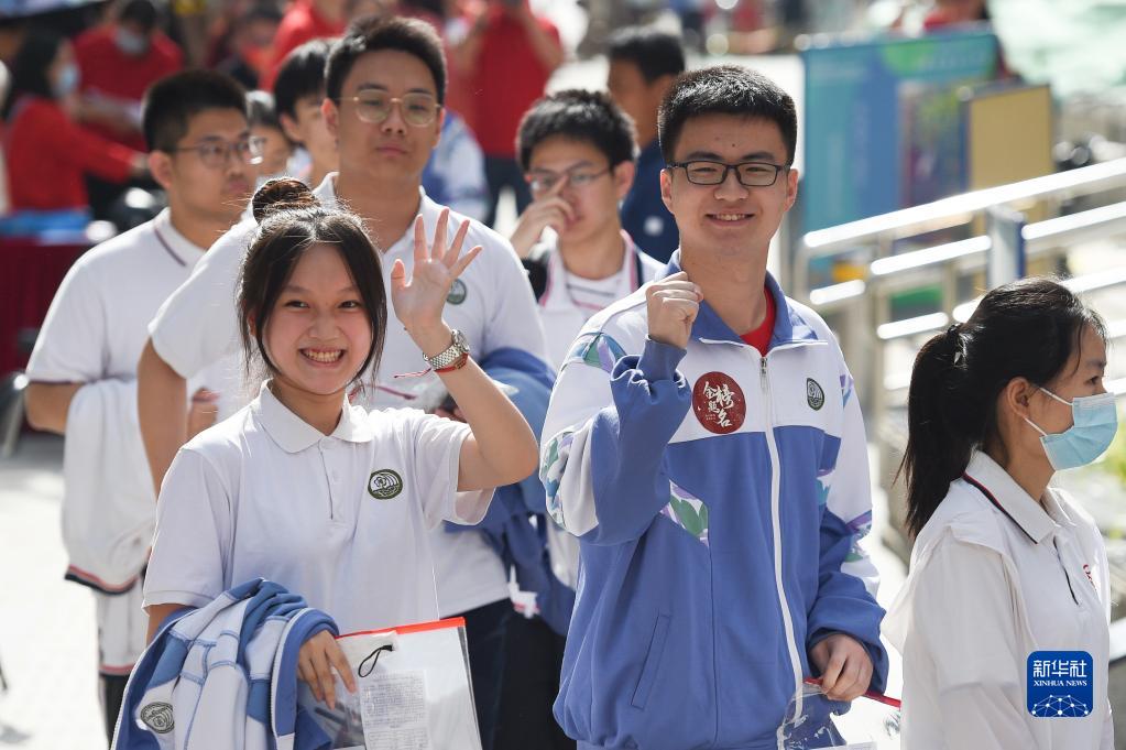 6月7日,在北京市陳經(jīng)綸中學(xué)考點(diǎn),考生在排隊進(jìn)入考點(diǎn)時(shí)向家長(cháng)和老師致意。