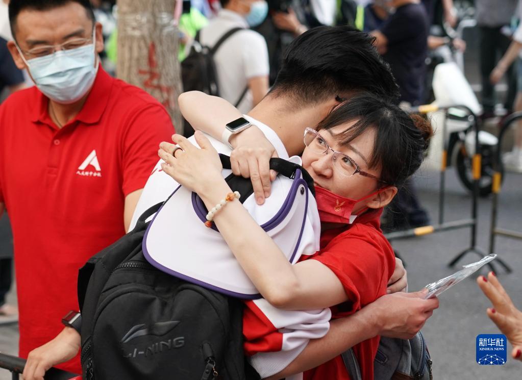 6月7日,在中國人民大學(xué)附屬中學(xué)考點(diǎn),送考老師與一位考生擁抱,為他加油鼓勁。