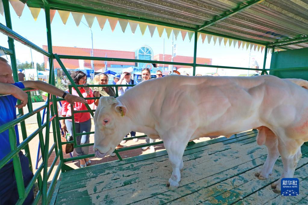 這是6月6日在白俄羅斯明斯克中白工業(yè)園拍攝的2023白俄羅斯國際農業(yè)展上的種牛。
