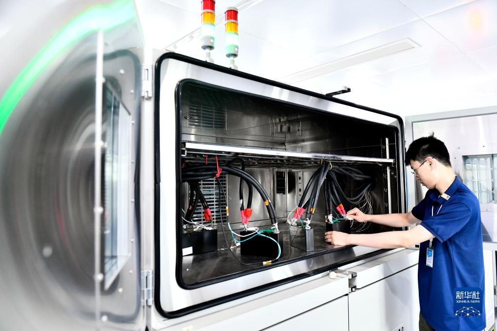 6月6日,在棗莊市國家鋰電池產(chǎn)品質(zhì)量檢驗檢測中心,工作人員對鋰電池進(jìn)行檢驗。