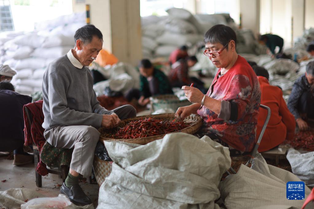 6月6日,工人在貴州省遵義市中國辣椒城進(jìn)行辣椒脫把。