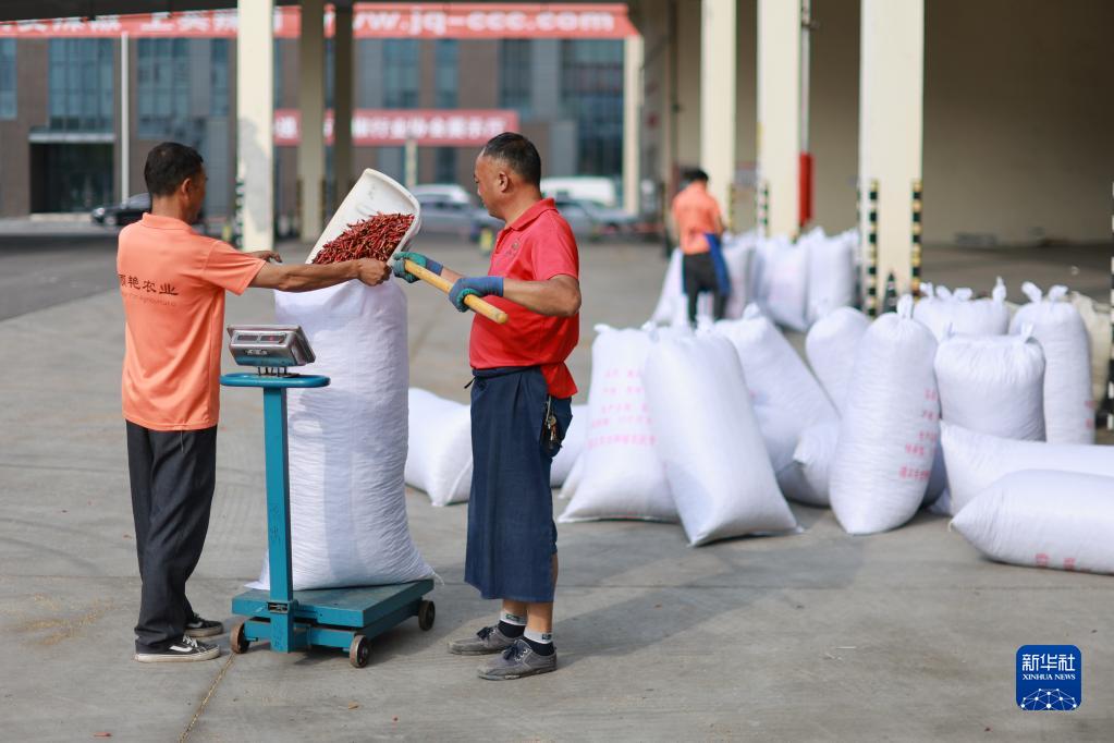 6月6日,工人在貴州省遵義市中國辣椒城將辣椒裝袋。