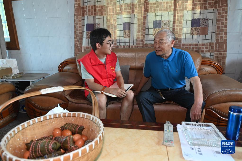 6月7日,安華鎮的青年志愿者與球山村81歲的獨居老人許仲魯(右)聊天,收集和記錄民情實(shí)際、民生需求。