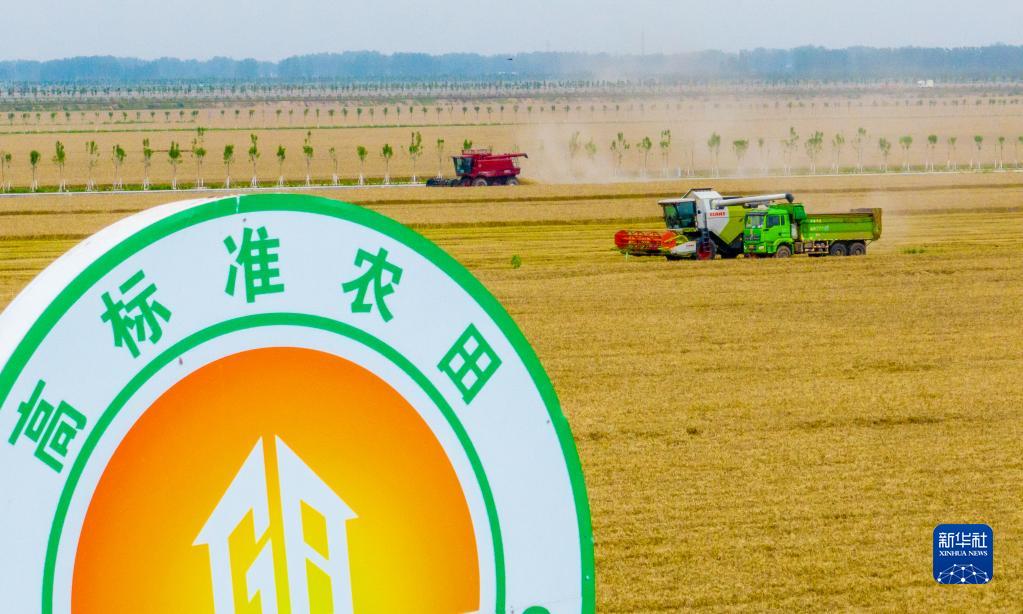 “三夏”時(shí)節,在河南省駐馬店市西平縣老王坡高標準農田,農機手操作大型收割機收割小麥,田間地頭一派忙碌景象。