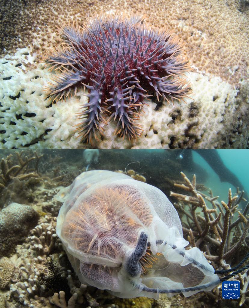 這是一張拼版照片:上圖為在蜈支洲島海域海洋牧場(chǎng)發(fā)現的長(cháng)棘海星(5月17日攝);下圖為蜈支洲島旅游區海洋部員工將長(cháng)棘海星“打包”準備帶上陸地處理(5月17日攝)。