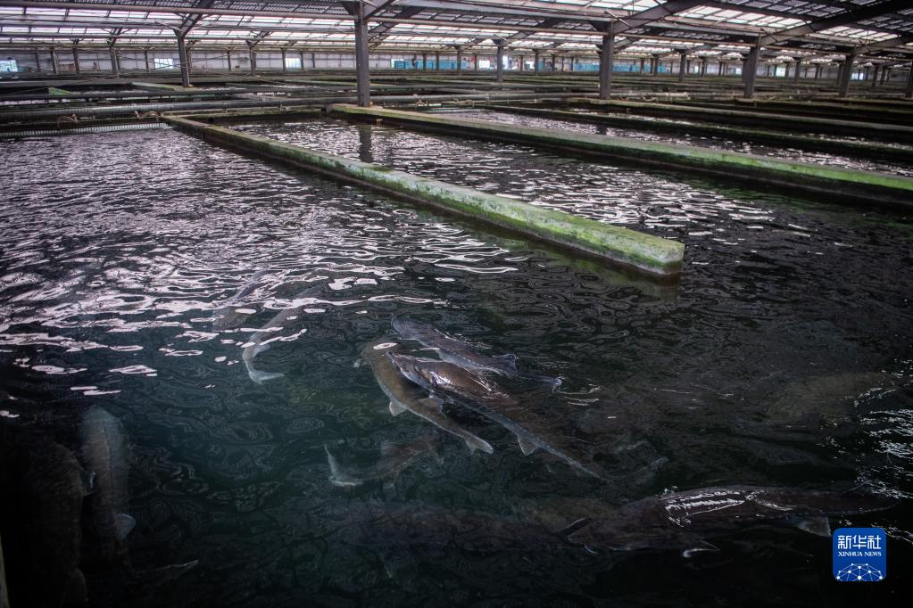 6月7日在中國清江(宜都)鱘魚(yú)谷養殖車(chē)間拍攝的鱘魚(yú)。