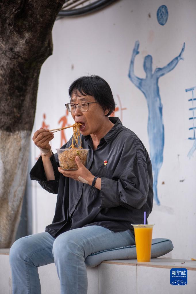 6月7日,張桂梅在考場(chǎng)外吃午飯。