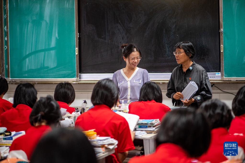 張桂梅(右)與畢業(yè)班的老師交流情況(6月6日攝)。