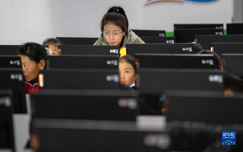 6月5日,拉巴卓瑪老師在給扎西宗鄉完全小學(xué)六年級的學(xué)生上計算機課。新華社記者 費茂華 攝