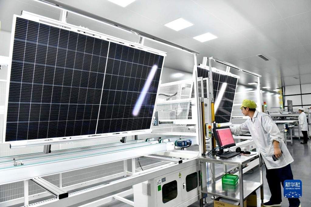 6月7日,在山東泉為新能源科技有限公司,工作人員在質(zhì)檢光伏組件。