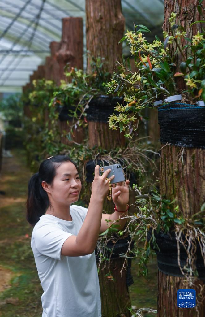 6月8日,游客在諸暨市東白湖鎮的鐵皮石斛有機種植基地里游玩。