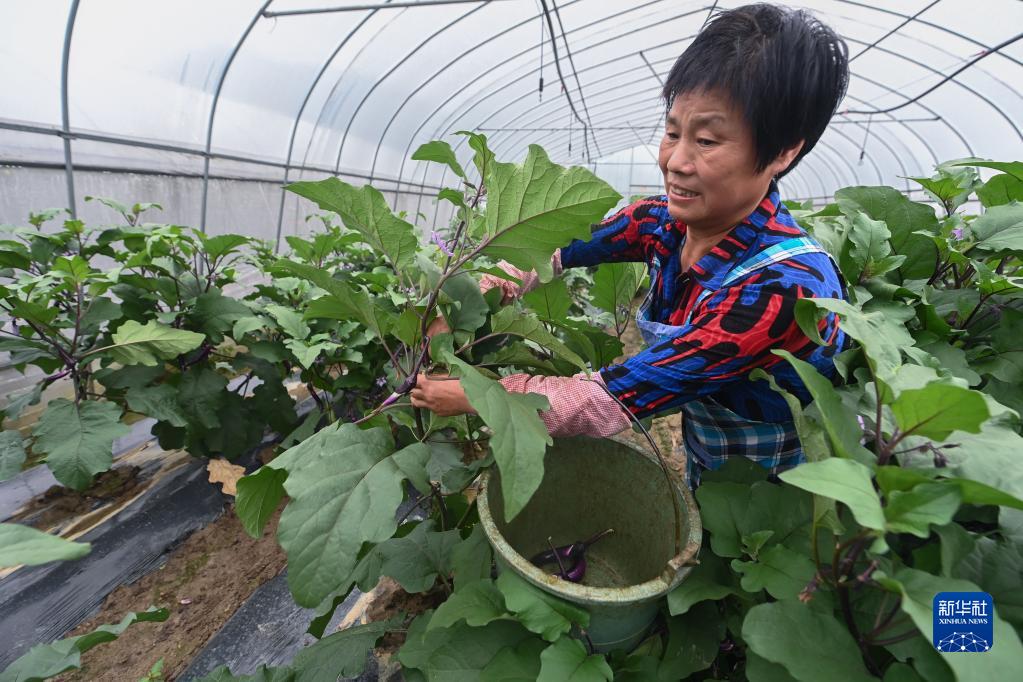 6月8日,在東白湖鎮孝義村的“美麗菜園”吳管家蔬菜基地的大棚內,村民正在采摘成熟的茄子。