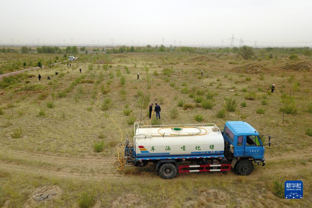 6月2日,在武威市古浪縣,八步沙林場(chǎng)職工給一片梭梭林澆水(無(wú)人機照片)。
