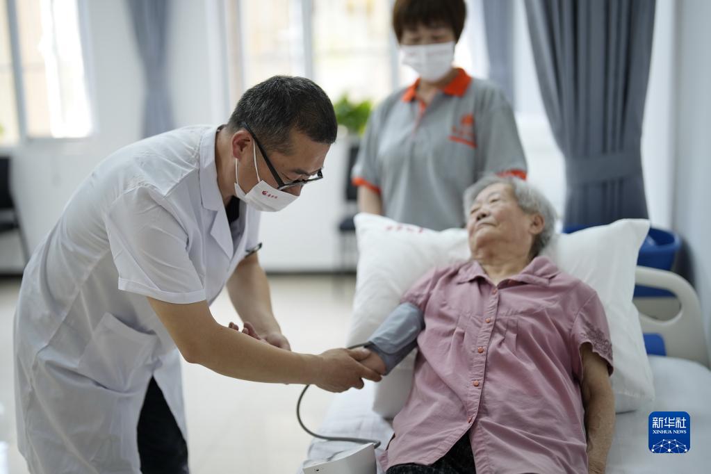6月8日,河北省灤州市灤城街道東南都會(huì )社區一家社區養老中心的工作人員在給老人測量血壓。
